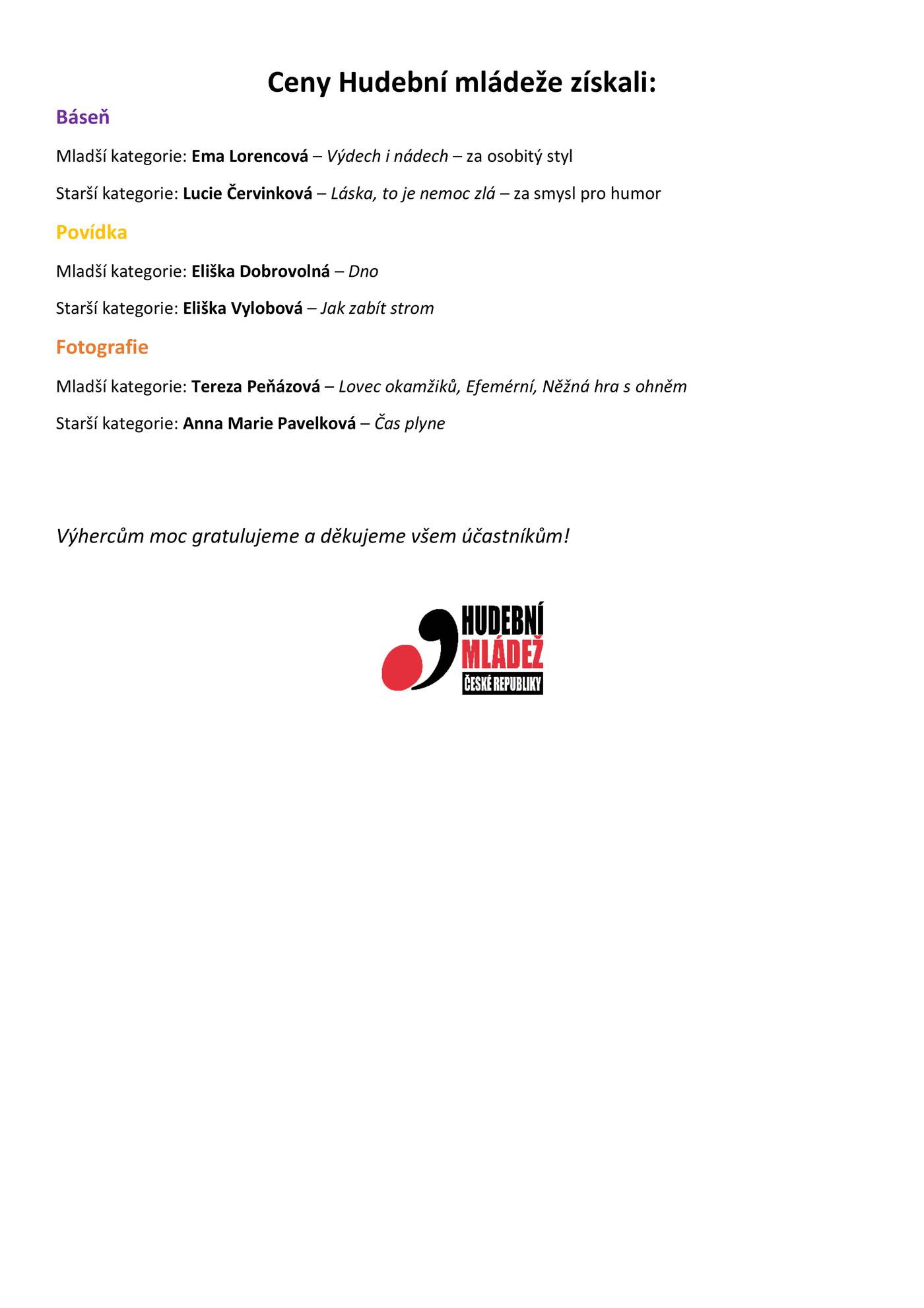Děkujeme vedení Hudební mládeže, předsedovi Pavlu Smrkovskému a general secretary Martině Náhlíkové, za spoluorganizaci projektu.