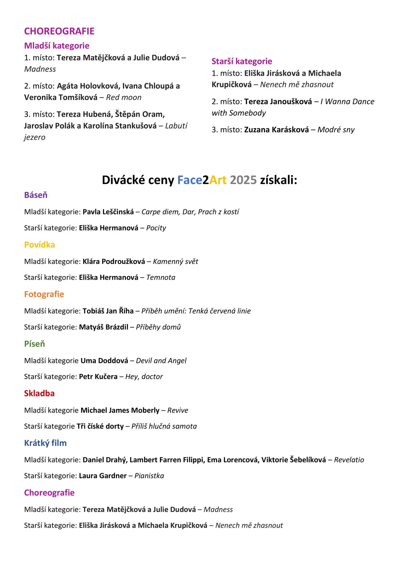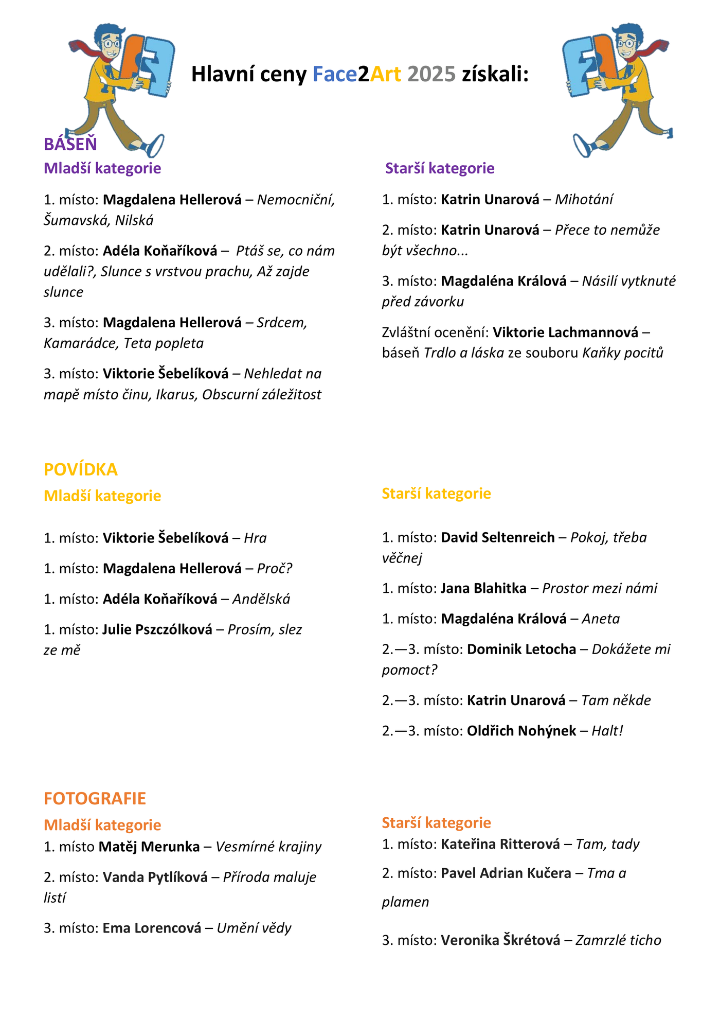 Jak dopadl letošní ročník Face2Artu? Přijďte to zjistit! Slavnostní vyhlášení Face2Art se koná 13. prosince 2025 od 14.00 do 17.00 v budově HAMU v Praze. Více informací ZDE.