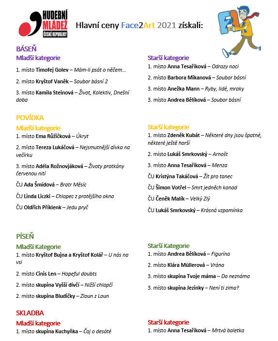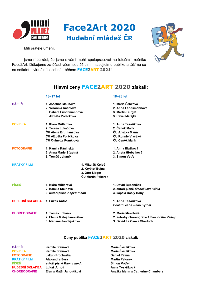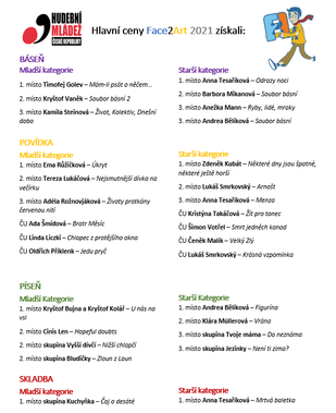 Zveme vás na slavnostní vyhlášení jubilejního 10. ročníku našeho soutěžního projektu Face2Art, které se uskuteční v sobotu 11. prosince 2021 v Praze. Bližší informace a přihlášky najdete ZDE.