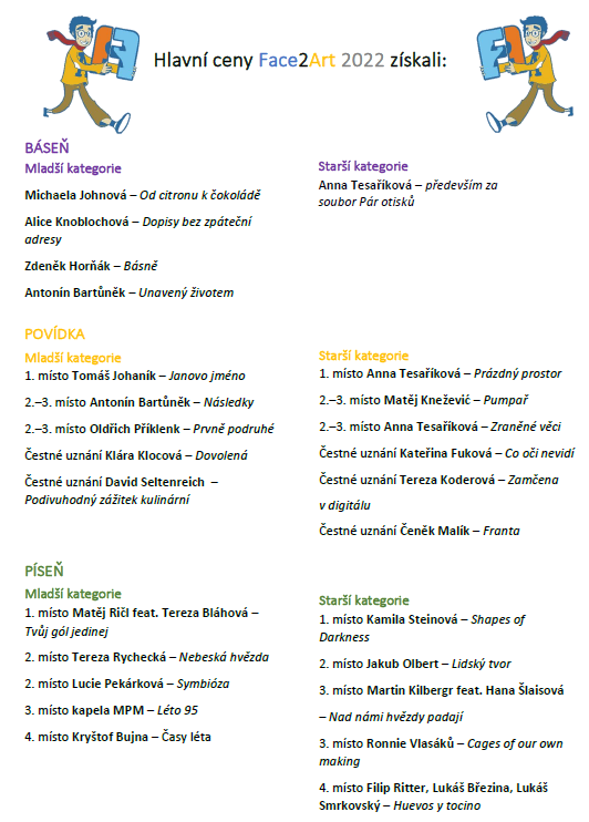 Zveme vás na slavnostní vyhlášení výsledků 11. ročníku naší soutěže Face2Art, které se uskuteční v sobotu 10. prosince 2022 v budově HAMU v Praze. Těšit se můžete na vystoupení letošních tvůrců Face2Art, povídkový workshop patronky Daniely Fischerové, vyhlášení a předání cen a také open mic.