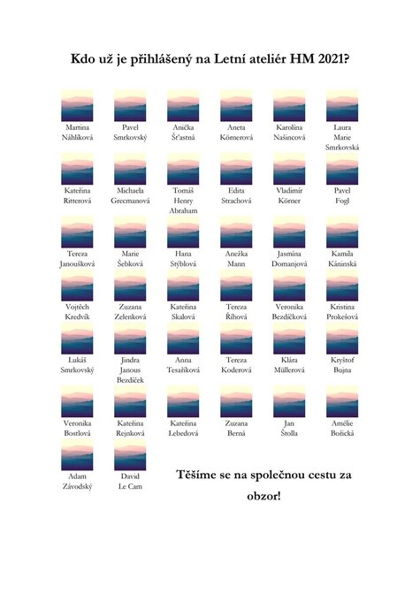 Chcete vědět, kdo je přihlášený na Letní ateliér HM 2021? Pojeďte s námi i vy od 1. do 10. července 2021 do Třeboně, vydejte se s námi ZA OBZOR a poznejte skvělé přátele a jedinečné hosty.
