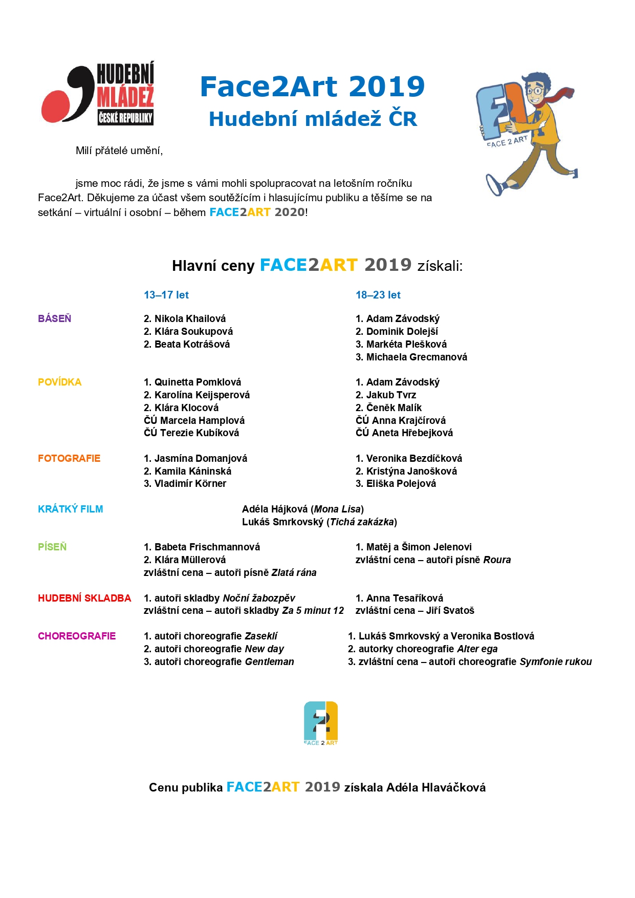 Děkujeme návštěvníkům webových stránek www.face2art.cz, kteří hlasovali v Divácké soutěži a pomohli tvůrcům získat Cenu publika.