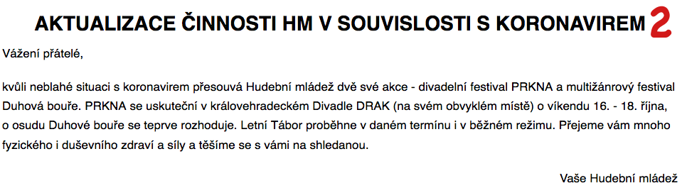 vzhledem k opatřením Vlády ČR nemůžeme realizovat náš divadelní festival Prkna v Hradci Králové.