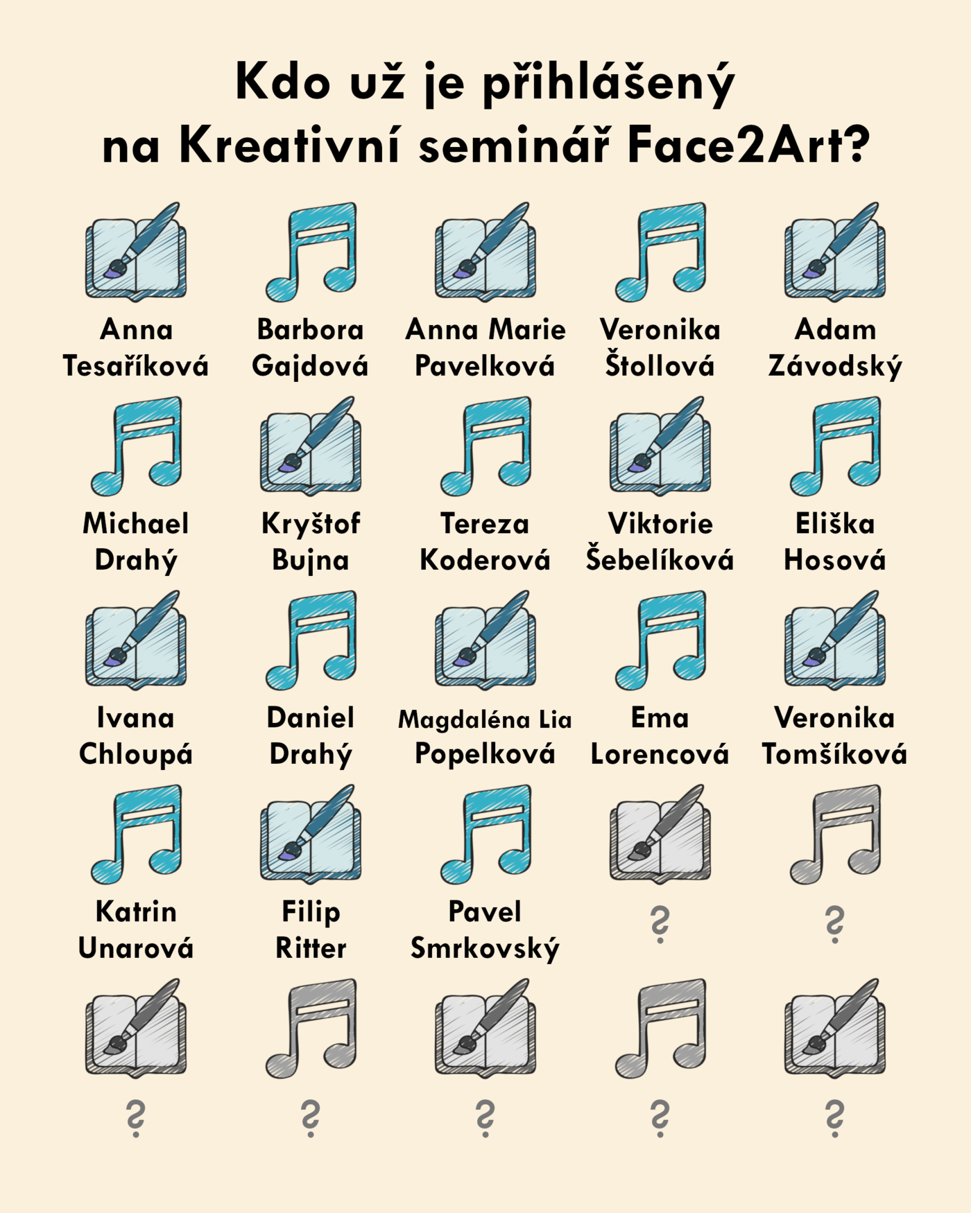 Čeká nás mimo jiné tvorba choreografií s taneční lektorkou a choreografkou Rebekou Šťastnou, skládání písní s básníkem a hudebníkem Lukášem Smrkovským, natáčení filmů, vytváření experimentálních hudebních skladeb a nebude chybět ani fotografování a literatura ve všech myslitelných podobách :)